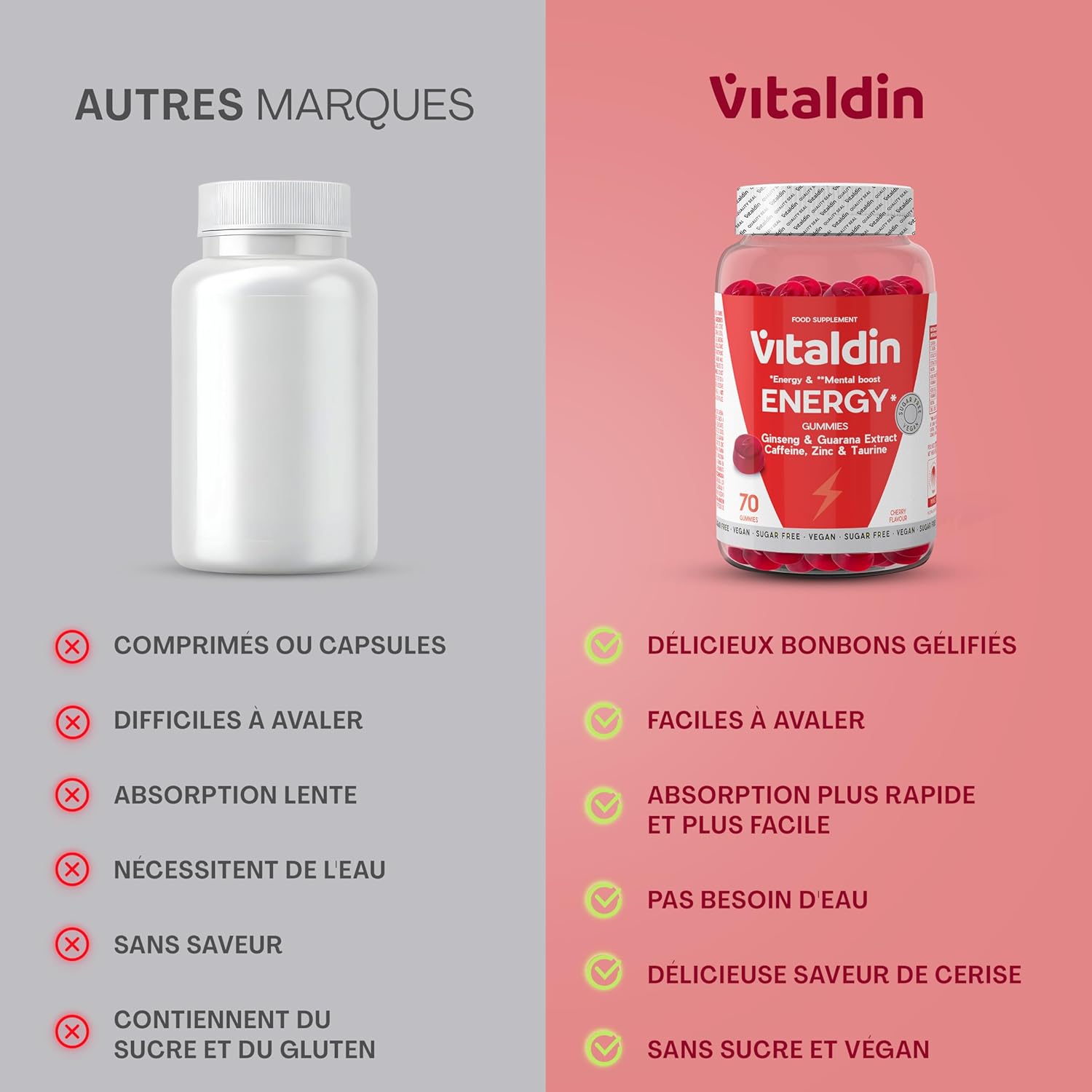VITALDIN Energy Gummies – Vegan and Sugar Free Energy Gummies – With Ginseng, Guarana, Caffeine, Taurine and B Vitamins – Improves Concentration and Reduces Fatigue – Cherry Flavour – 70