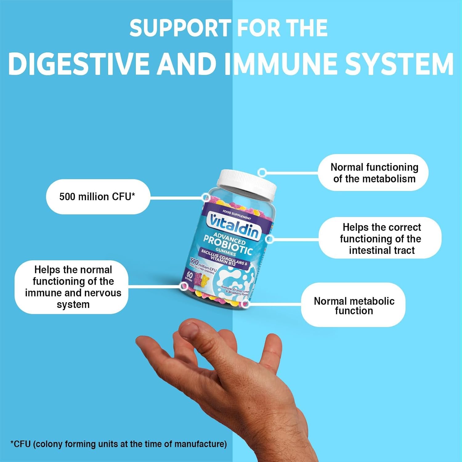 WHAT IS BACILLUS COAGULANS? Bacillus coagulans is a beneficial bacterium that copes well with extreme and aggressive conditions, both in the human body and in food processes, unlike other probiotics. In every dose of VITALDIN probiotic, you will ingest up to 500 million strains of this bacteria! In addition, they are enriched with vitamin B12, which contributes to normal energy metabolism and normal functioning of the immune system.