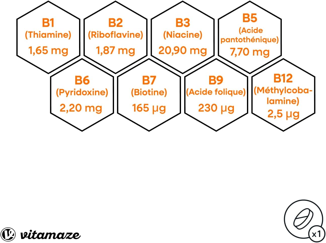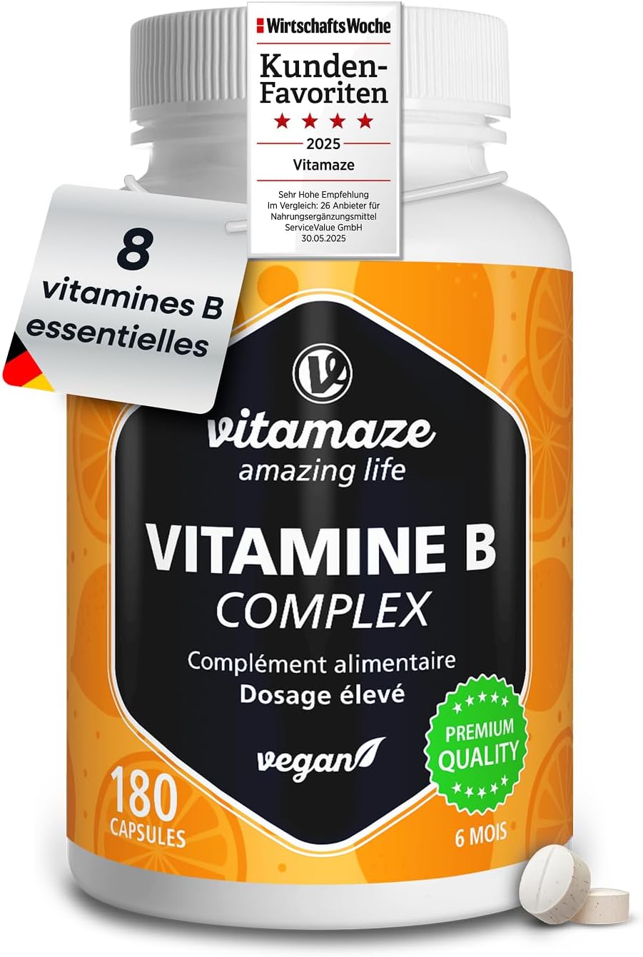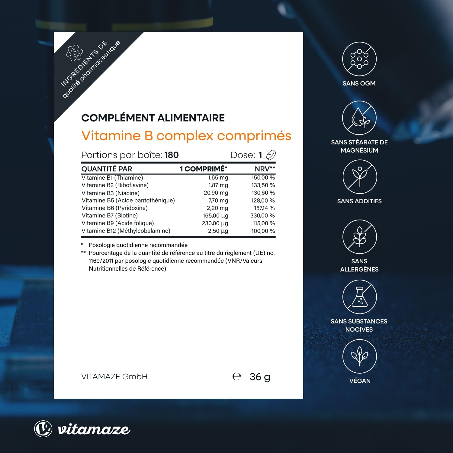 HIGHLY DOSED: 180 small vegan tablets for a continuous supply of 6 months with the 8 essential B vitamins B1 (thiamine), B2 (riboflavin), B3 (niacin), B5 (pantothenic acid), B6 (pyridoxine), B7 (biotin), B9 (folic acid), B9 (folic acid), B6 (pyridoxine), B7 (biotin), B9 (folic acid), B6 12 (meme thylcobalamin).