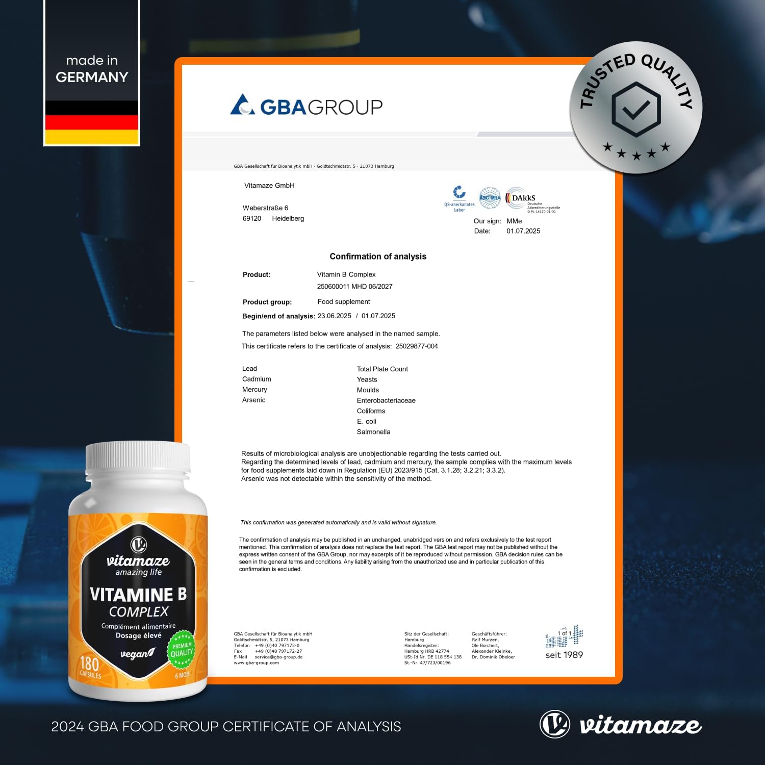 Vitamin B Complex Strong with Vitamin B1, B2, B3, B5, B6, B7 (Biotin), B9 (Folic Acid) and B12 – For 6 Months – Natural and Vegan Energy and Vitality – Vitamaze