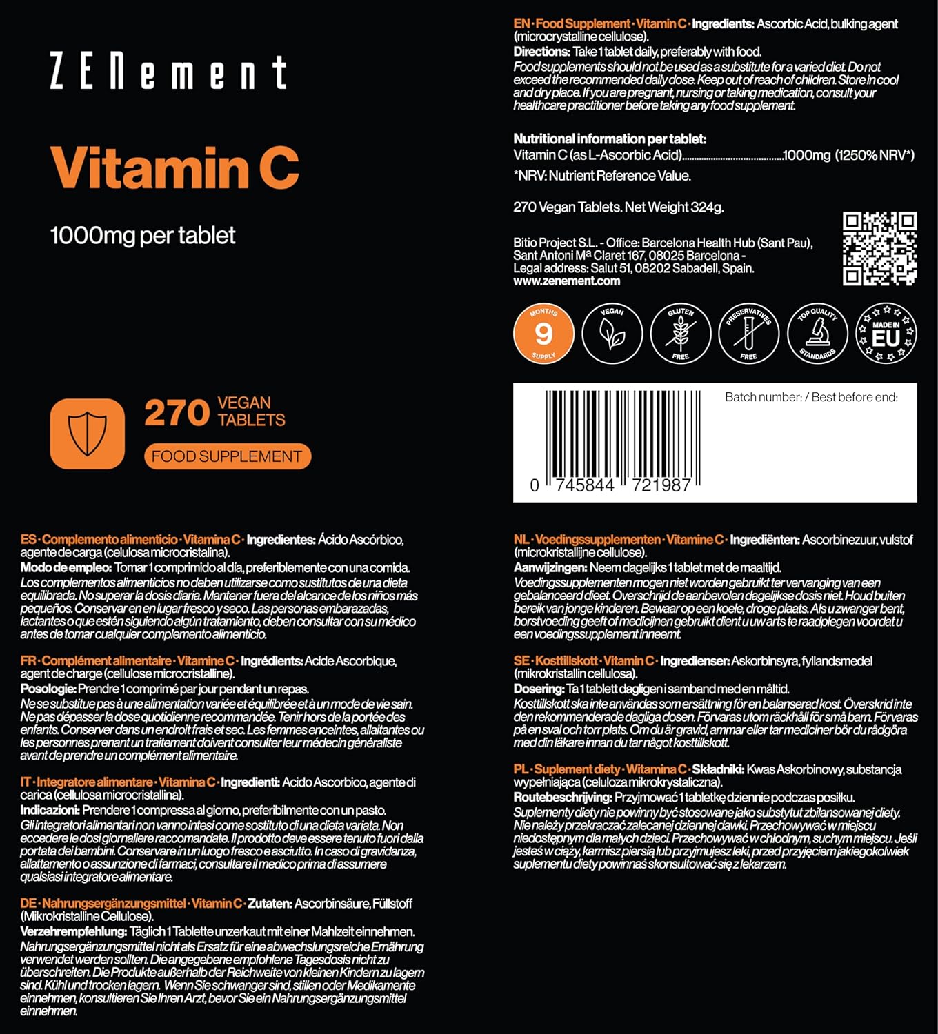 Vitamin C 1000 mg, 270 Vegan Tablets (Supply for 9 Months) – Antioxidant, Reduces Fatigue and Burnout – Single Tablet Per Day of Pure Vitamin C – Zenement