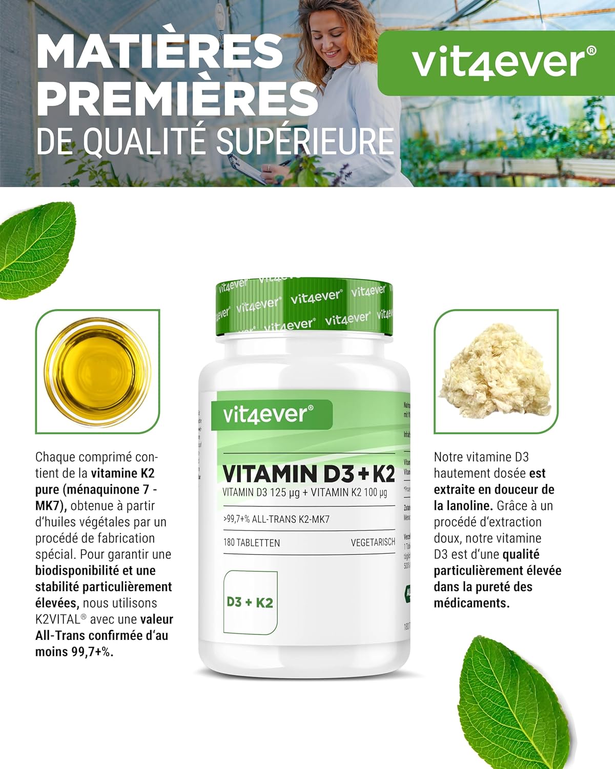 PREMIUM INGREDIENTS: For optimal bioavailability we use the K2VITAL raw material with a confirmed All trans value of at least 99.7%. Vitamin K2 is extracted from vegetable oils by a special process while vitamin D3 is carefully obtained from lanolin with high purity.