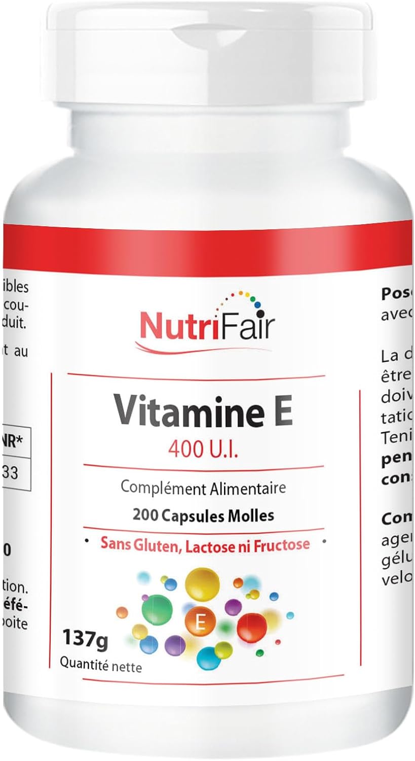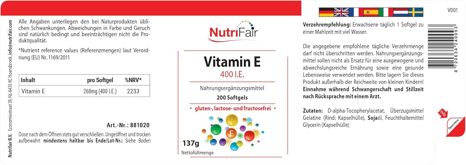 Vitamin E 400 IU from NutriFair is a high-quality dietary supplement that guarantees optimal vitamin E intake. Vitamin E, also known as tocopherol, is part of the fat-soluble vitamins and plays an essential role in many important body functions. Our product contains 400 international units (U.I.) of vitamin E per capsule and thus supports the daily needs of this essential nutrient.