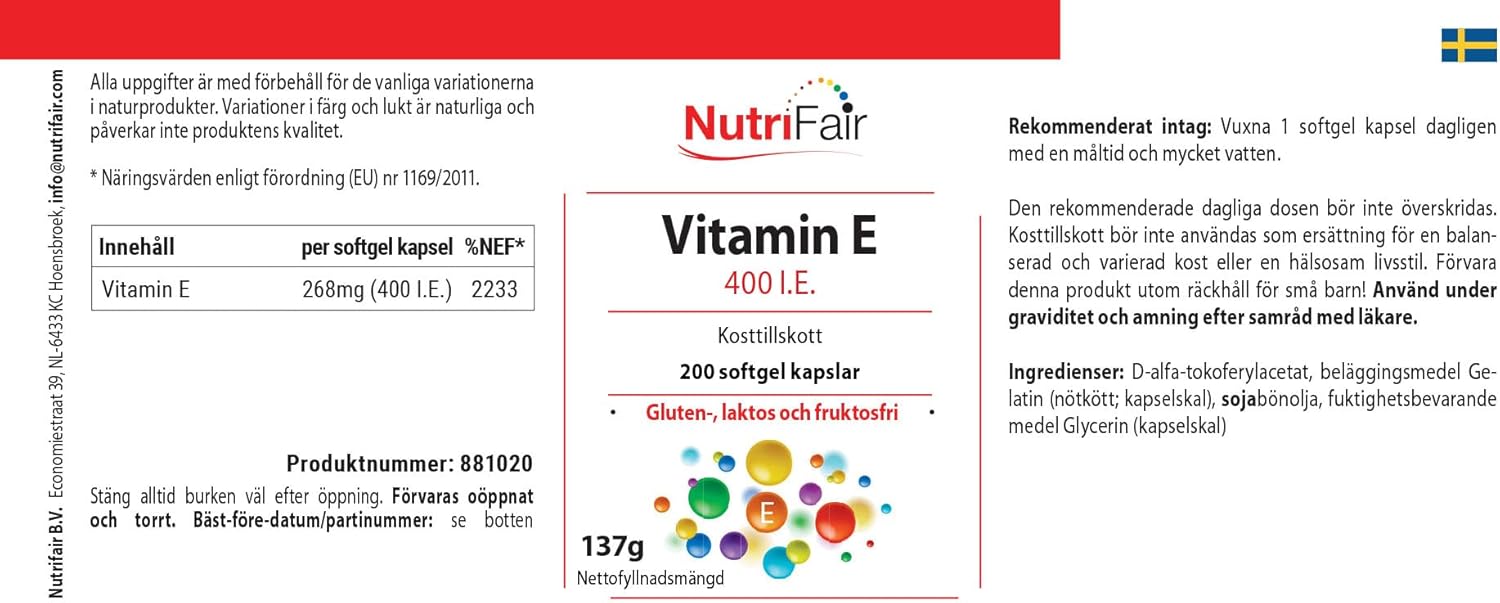 Vitamin E 400 I.U. – with 268mg of vitamin E per capsule – 200 soft capsules – high dosed – German production & laboratory tests – NutriFair | Premium & Fair
