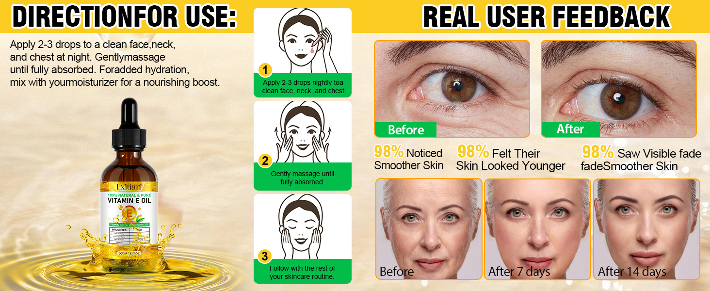 Natural and Nutritive Oil: We use natural plant ingredients extracted without chemicals to provide safe and effective care for your skin. Vitamin E Care Oil is composed of all-natural ingredients, 100% pure, vegan and cruelty-free vitamin E oil. Cold pressed, it is free from additives, sulfates, parabens and synthetic fragrances, chemicals and irritation. Safe to use. Lightweight, fast absorbing, suitable for all skin types, non-comedogenic and non-clogging. Ideal for sensitive, acne-prone or mature skin