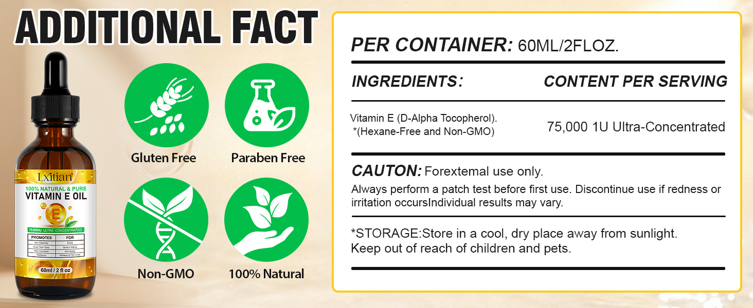 Nourishes and moisturizes the skin: It retains moisture and provides essential nutrients to the skin, allowing it to regain firmness and elasticity. PURE VITAMIN E OIL: All ingredients contain only undiluted Vitamin E oil, with a concentration of 75,000 IU for intense hydration. Leaves skin soft, elastic and radiant