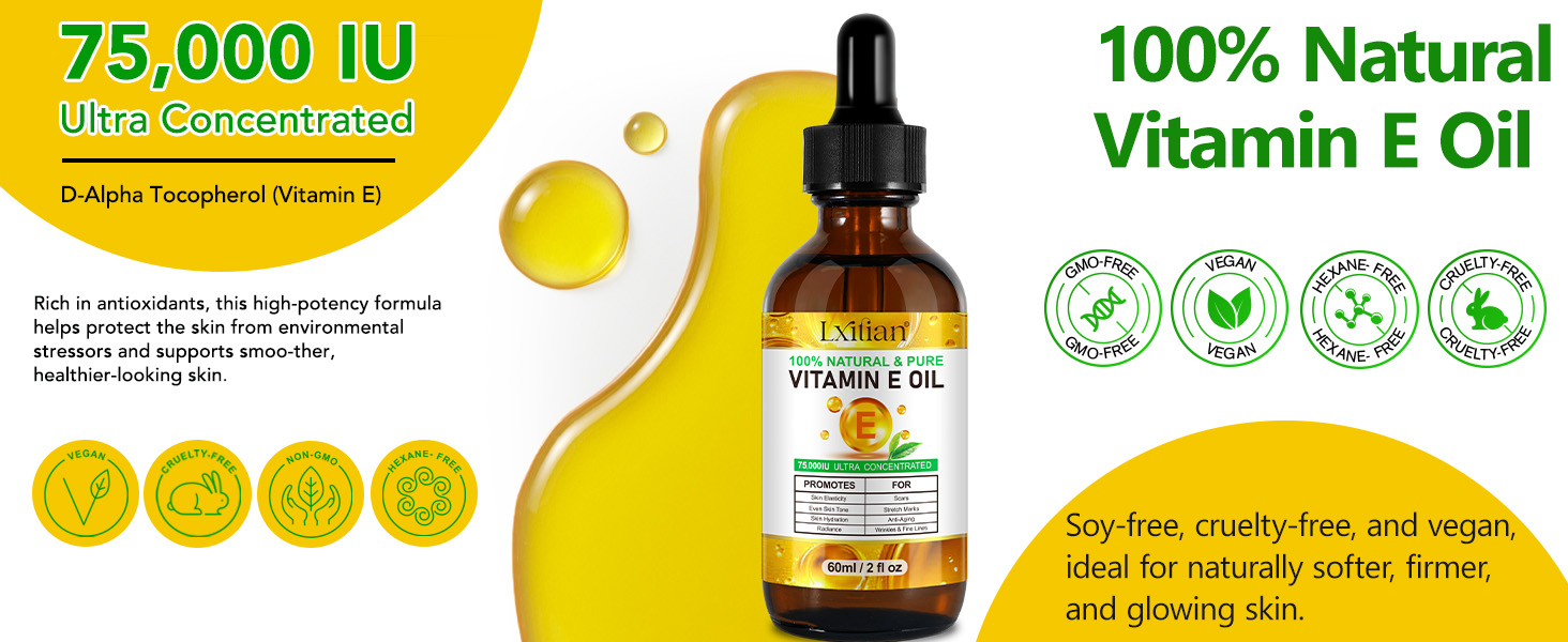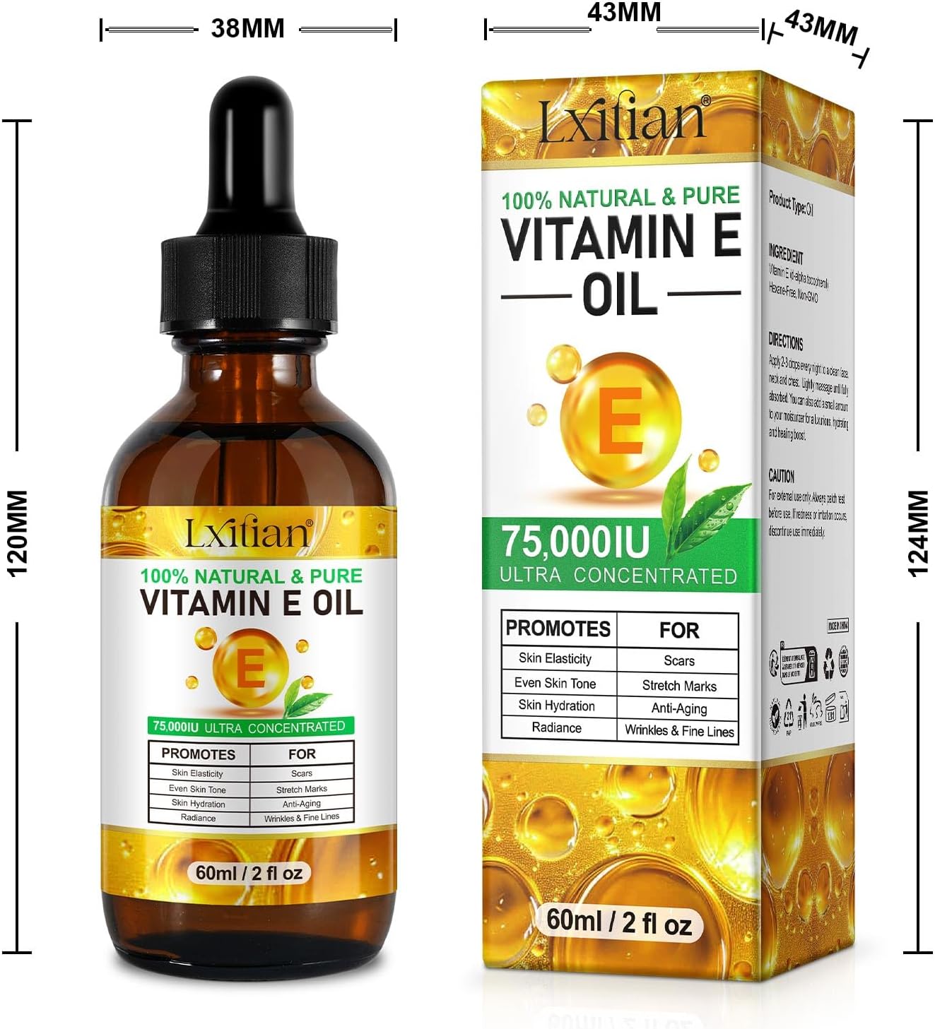 Vitamin E Oil, Vitamin E Oil 75,000 IU, 100% Natural Vitamin e Pure Liquid for Face, Hair, Nails & Skin, Anti-Aging & Anti-Wrinkle, For Scars and Stretch Marks