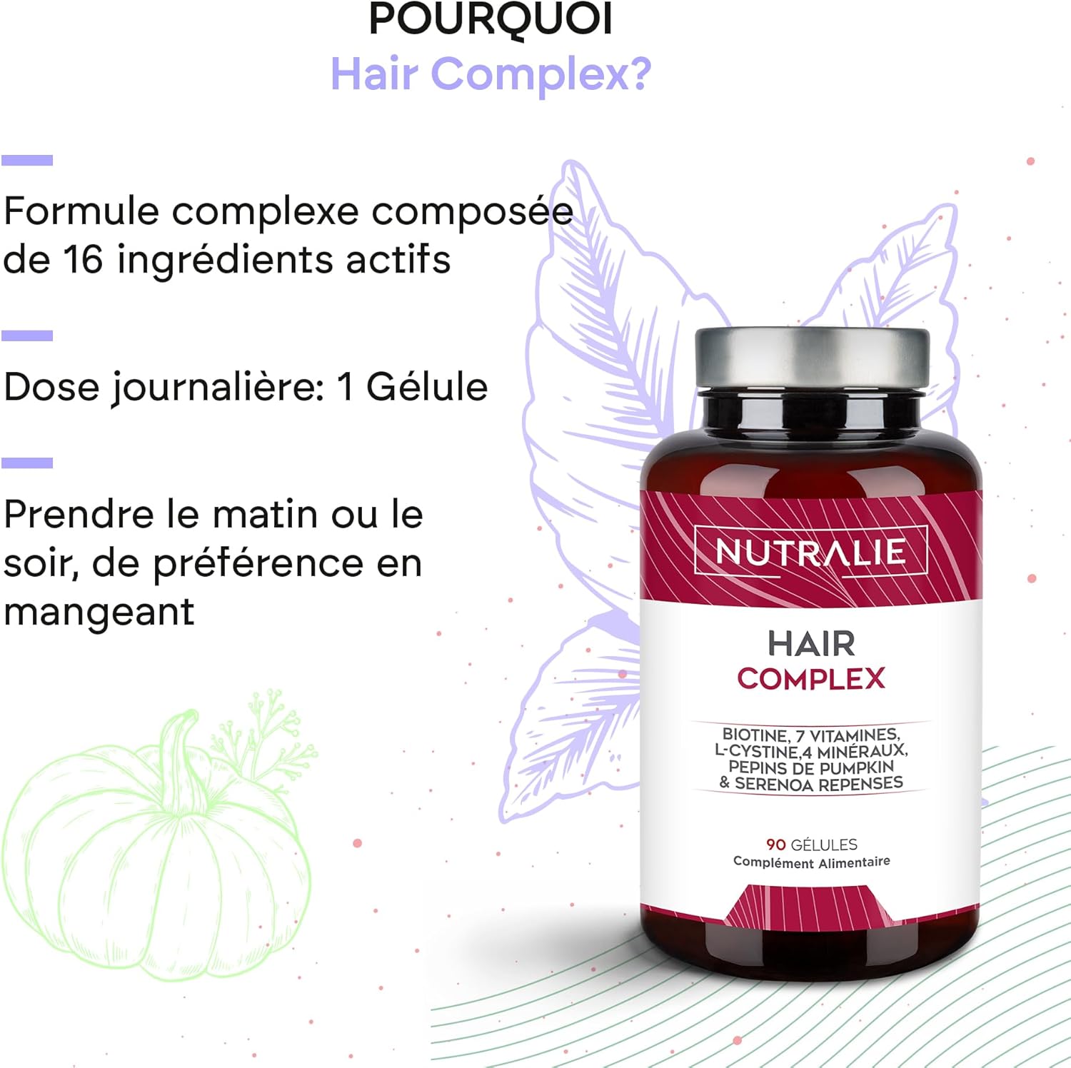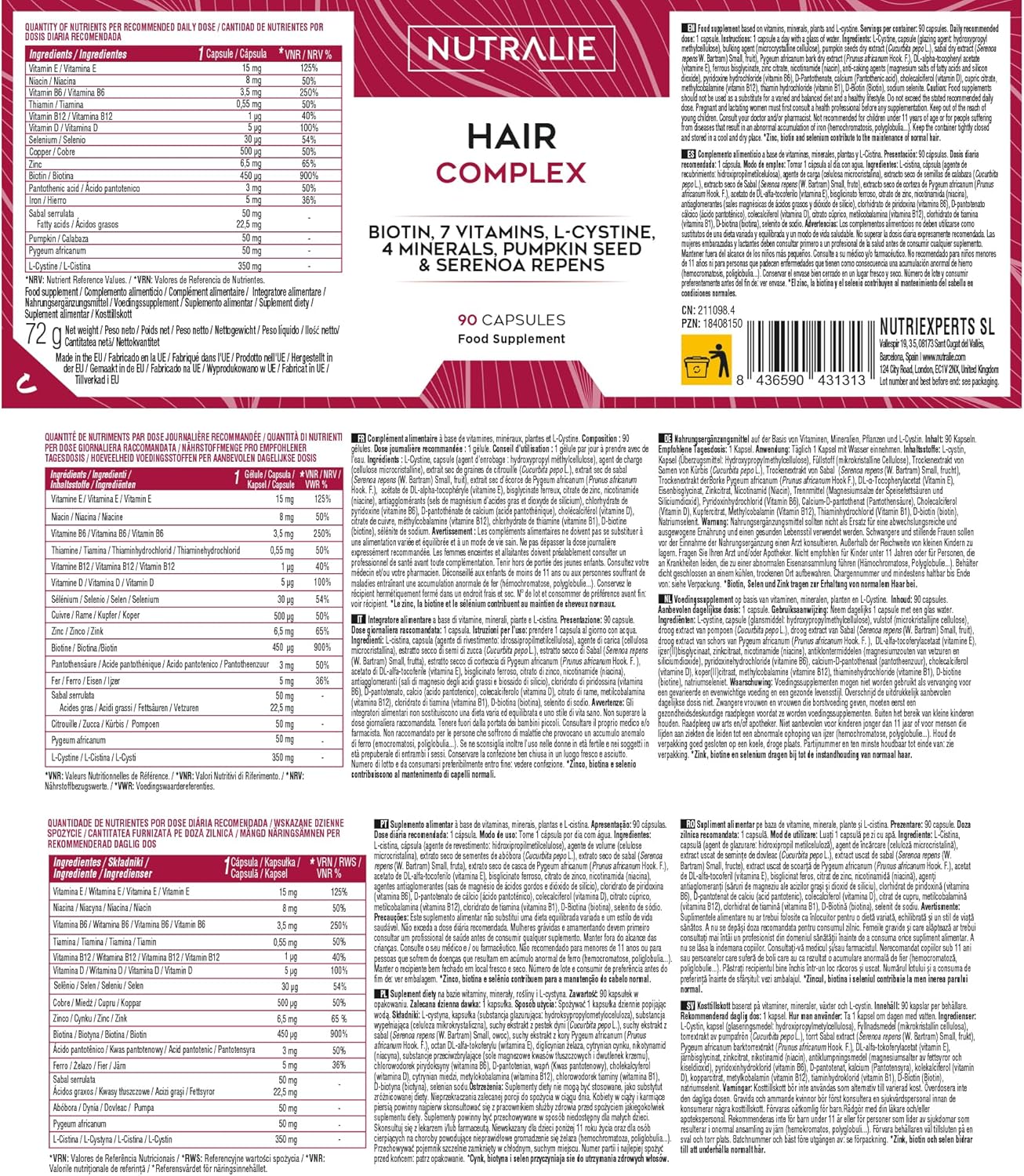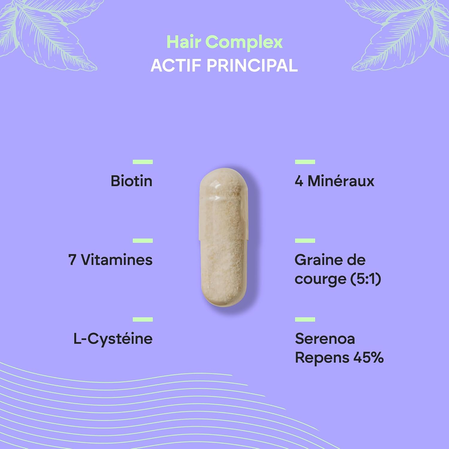 ️16 ACTIVE PRINCIPLES: Hair Complex contains not only Biotin, Zinc, Selenium, Vitamin E, Serenoa Repens and Squash Seeds, but also Vitamin B6, Vitamin B12, Vitamin D, Niacin, Thiamine, Copper, Pantothenic Acid. That of iron, from L-cysteine and Prunus Africana.