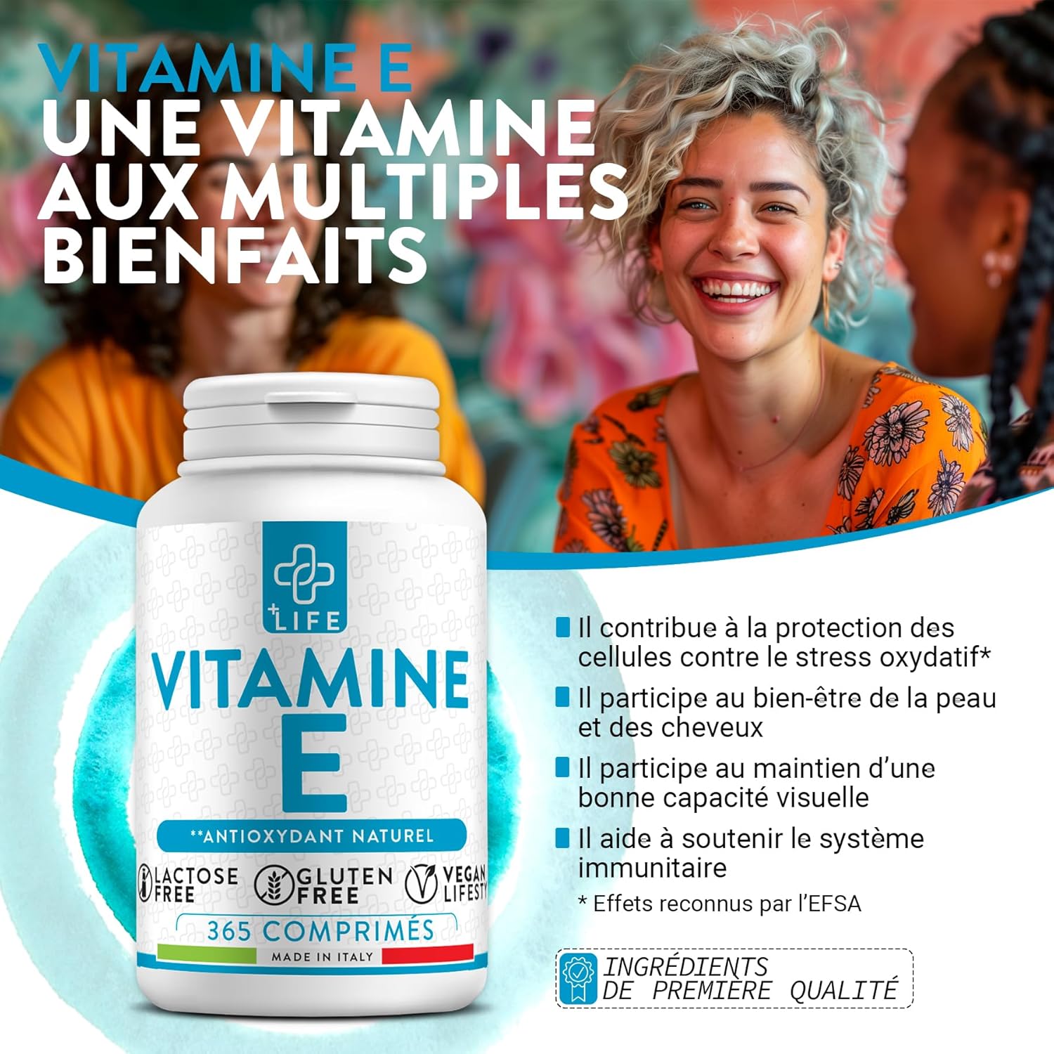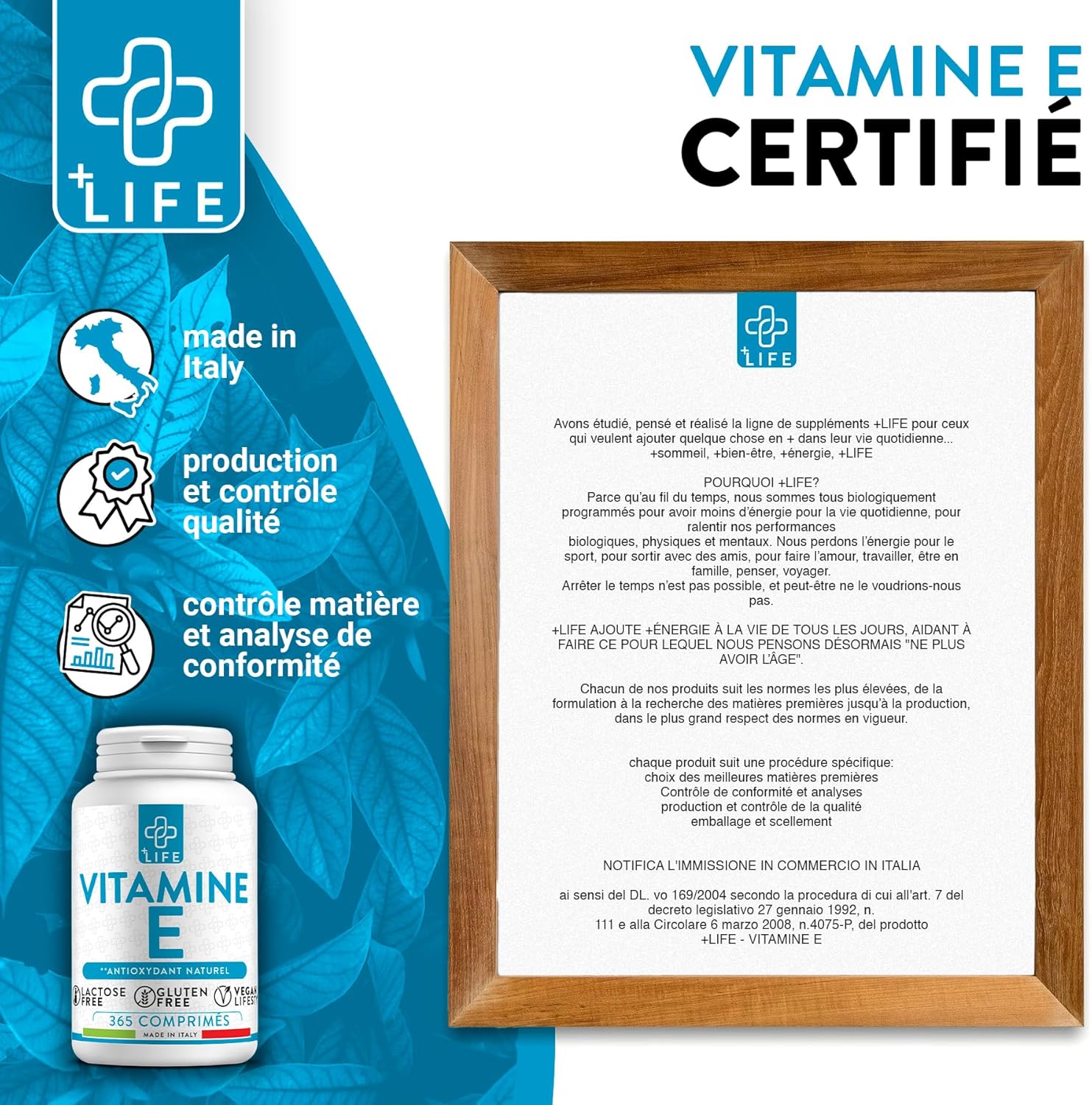 La vitamine E PiùLife contient 365 comprimés, pour une fourniture de 6 mois. Chaque comprimé apporte 60 mg de vitamine E, soit 89 U.I. Les bienfaits de cette vitamine sont multiples : elle peut être prise comme complément pour les yeux et la vue, comme vitamine E pour le visage, les cheveux et comme antioxydant
