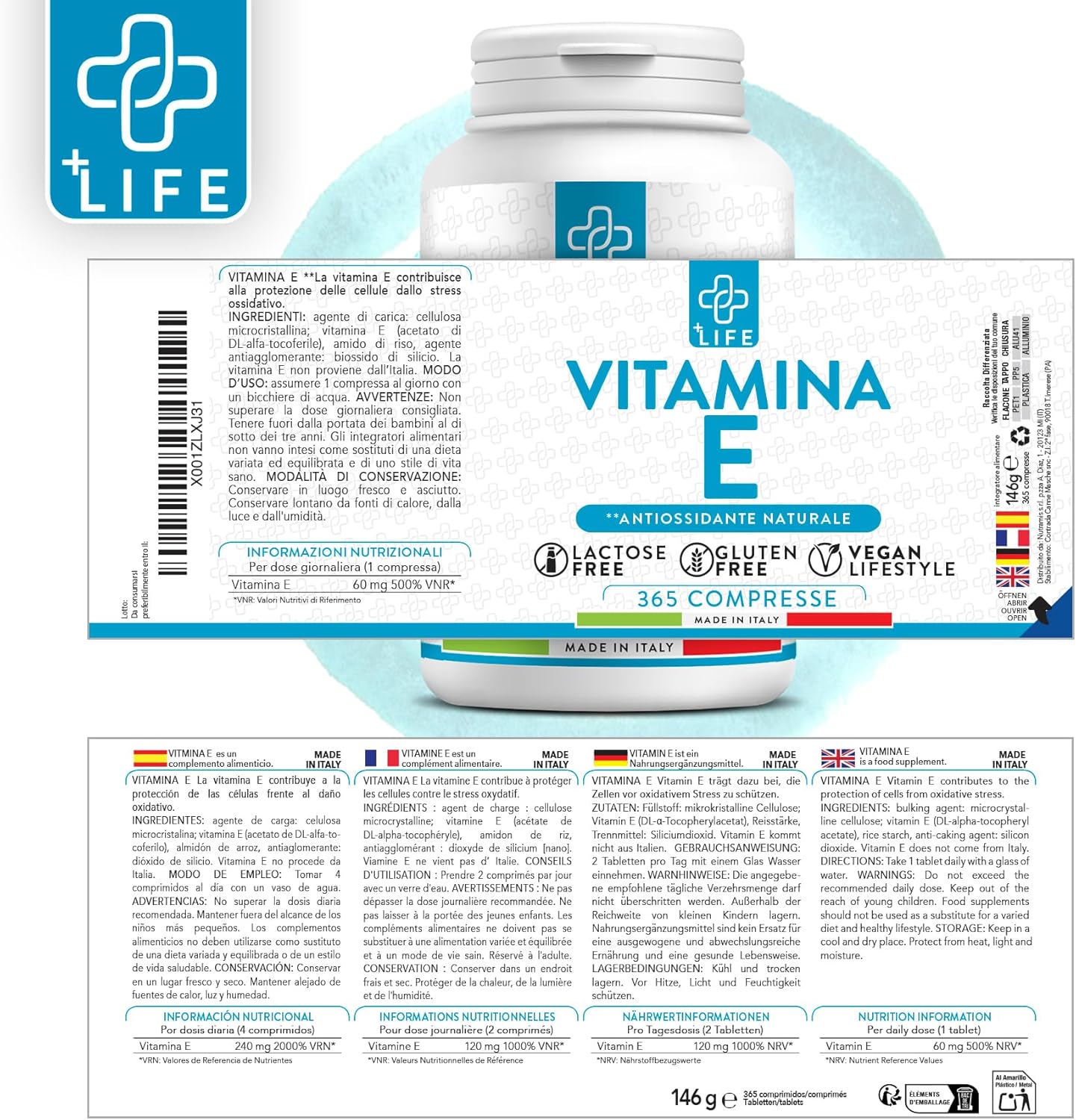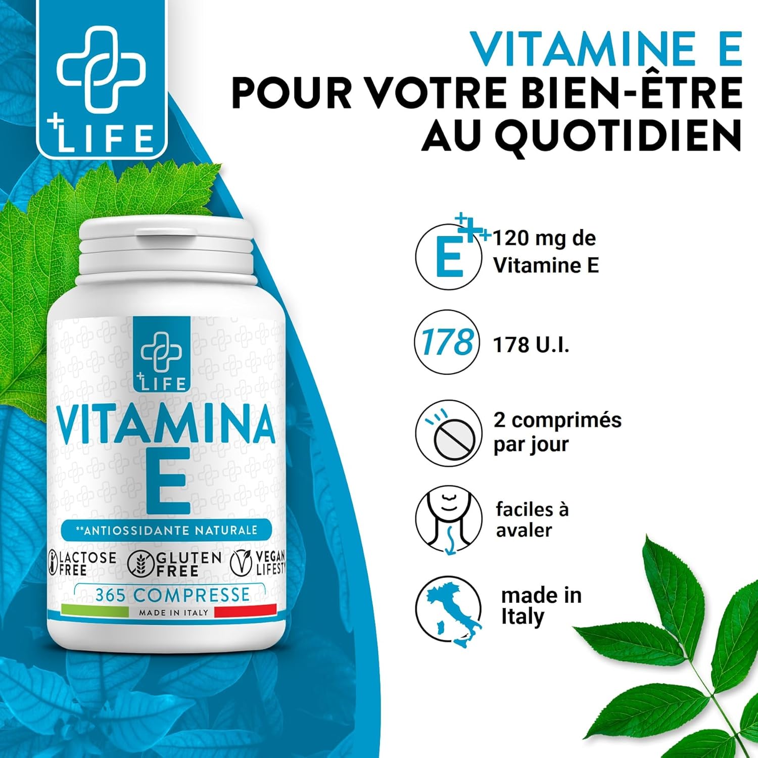 Vitamine E Pure 120mg Par Dose 178UI PiùLife, 365 Comprimés Complément Alimentaire Vitamine E Visage Peau, Yeux Vue, Vitamine Cheveux, Bien-être Antioxydant, 2 Comprimés Par Jour