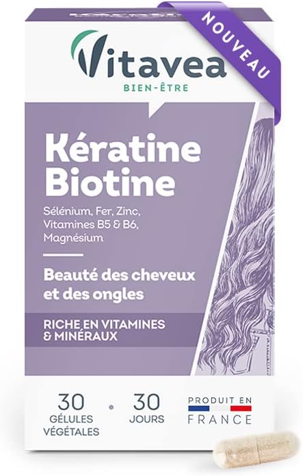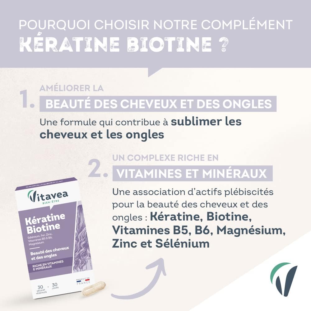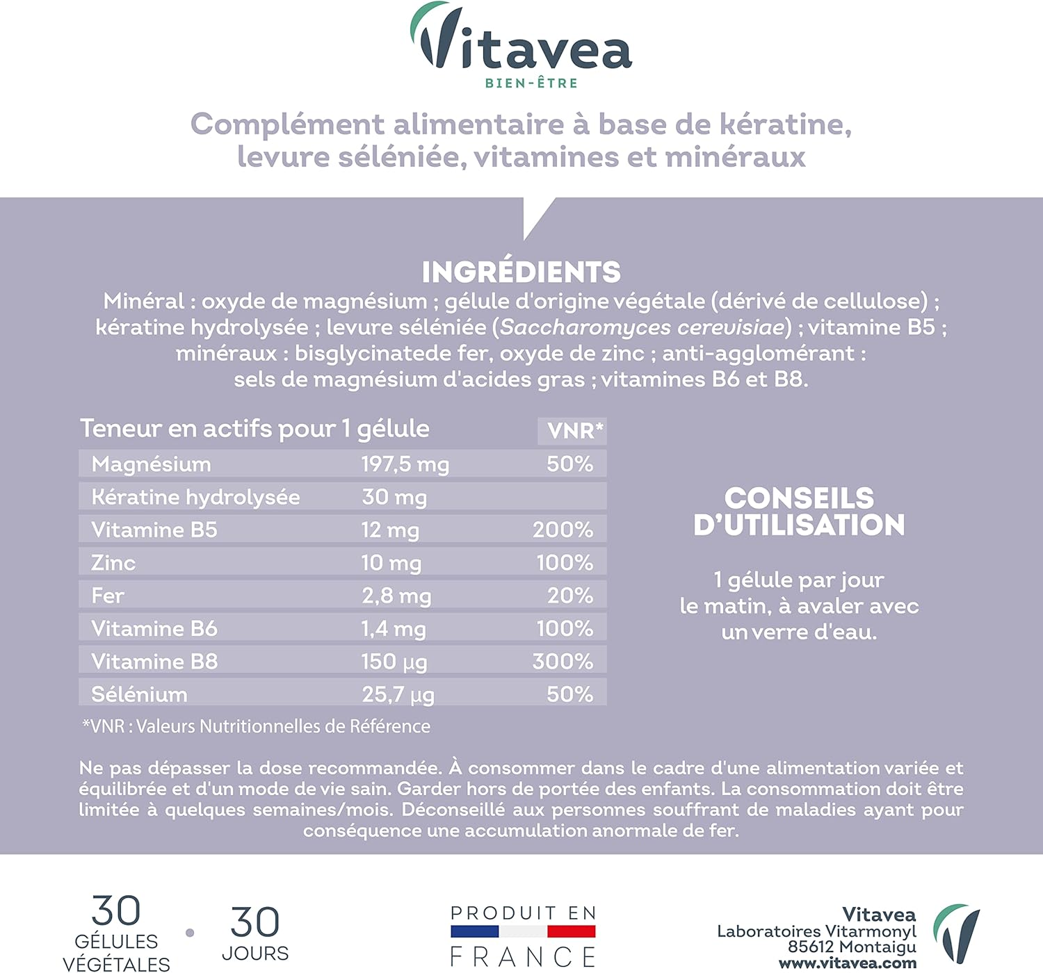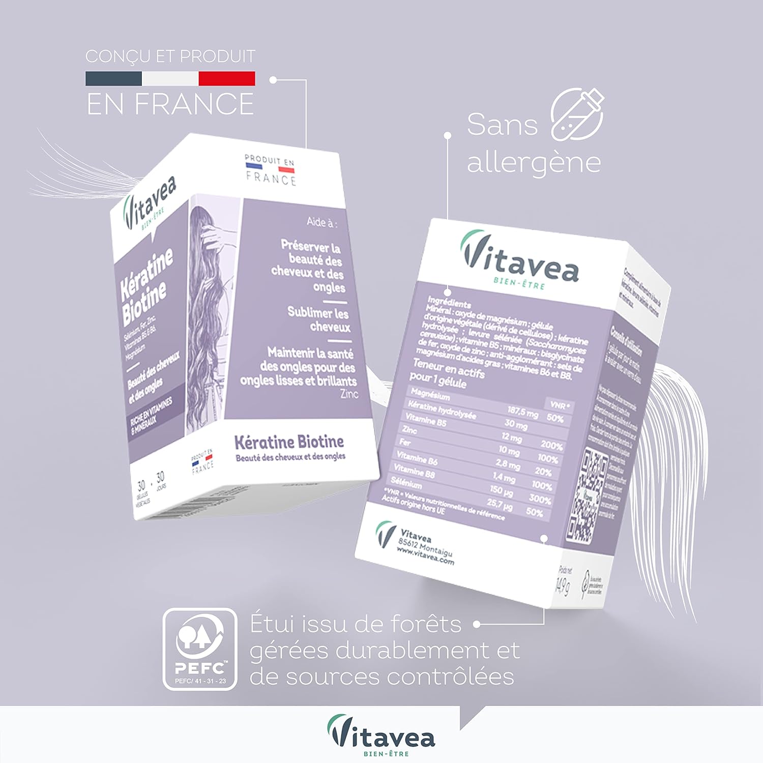 Nutritional supplement for beauty and strength of hair and nails: Vitavea hair care food supplement contains recognized and acclaimed active ingredients to promote the beauty of hair and nails. Its unique formula is composed of 6 nutrients including keratin, biotin (vitamin b8), zinc, iron and selenium. A concentrate of efficiency