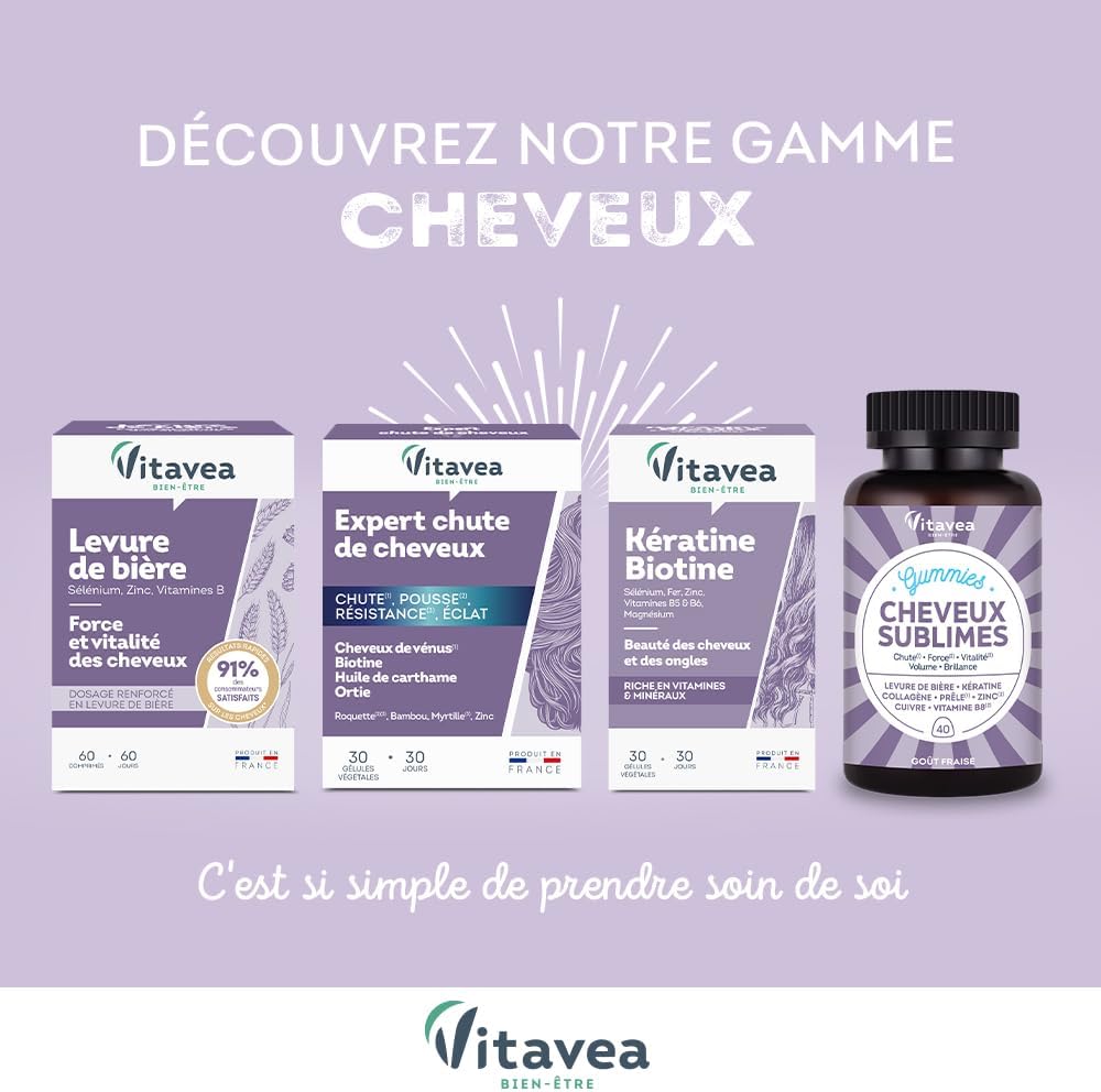 From hair to top: The secret of our Vitavea hair care supplement. Its formula contains recognized and acclaimed active ingredients to promote the beauty of hair and nails. Its formula contains keratin, B vitamins, including biotin (vitamin B8), and carefully selected minerals zinc and selenium. Together, these active ingredients have an optimal action on the beauty and vitality of hair and nails