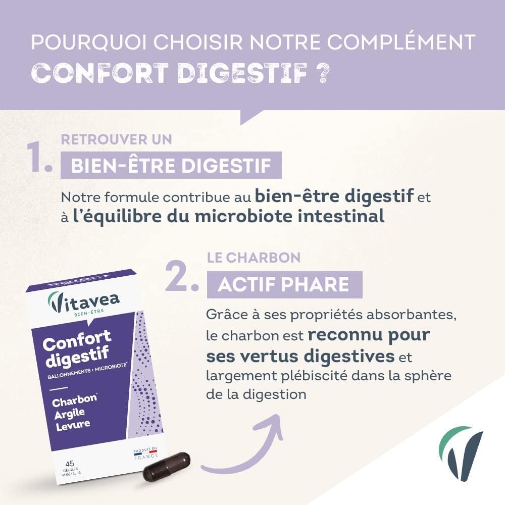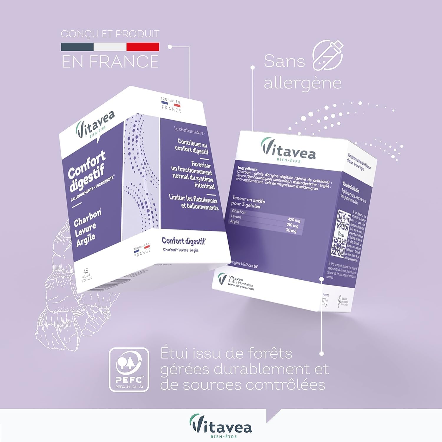ANTI BALLOON SOLUTION: The Vitavea intestinal comfort food supplement contains active charcoal, clay and yeast, recognized and acclaimed to contribute to digestive comfort, promote normal functioning of the intestinal system and limit flatulence and bloating. These combined actions promote digestive comfort and a flat stomach