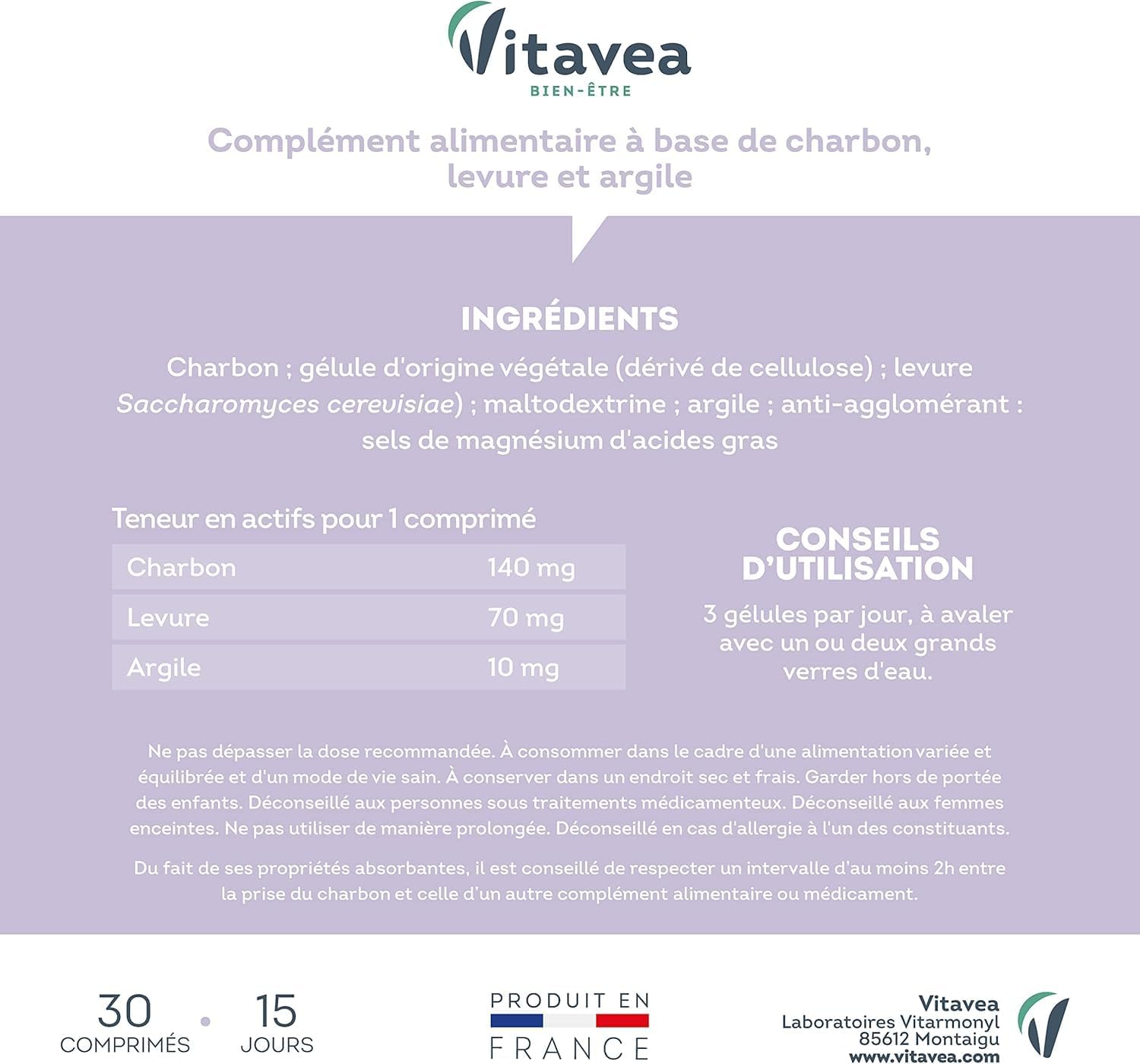 Made in France. The Vitavea food supplement based on activated carbon, clay and yeast is made in France and GMP (Good Manufacturing Practices), guaranteeing quality and respect for manufacturing processes