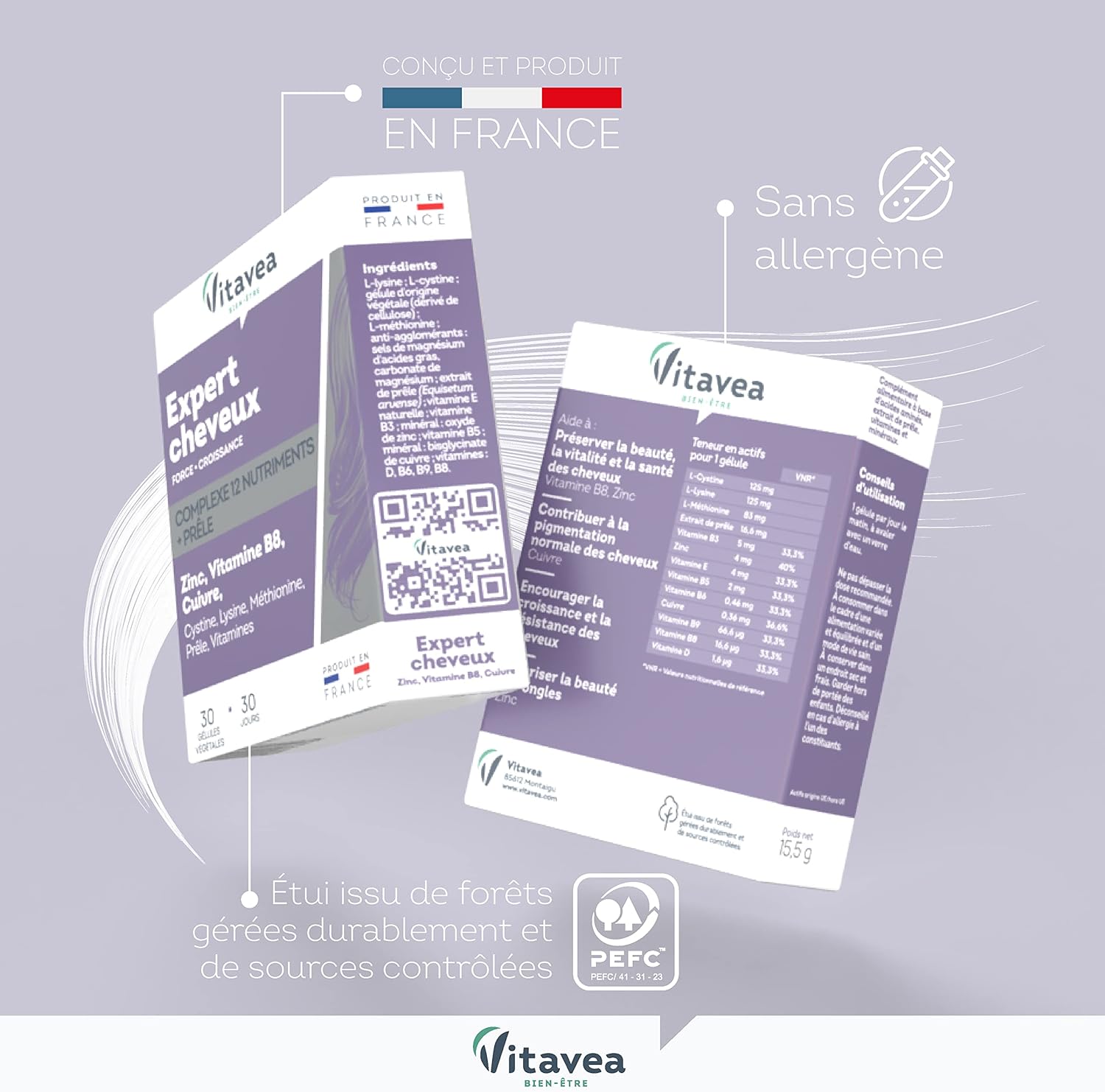 For 1 capsule: L-Cystine: 125 mg L-Lysine: 125 mg L-Methionine: 83 mg Horsetail: 16.6 mg Vitamin B3: 5 mg (33.3% NRV*) Zinc: 4 mg (40% NRV*) Vitamin E: 4 mg (33.3% VNR*) NR*) Vitamin B5: 2 mg (33.3% NRV*) Vitamin B6: 0.46 mg (33.3% NRV*) Copper: 0.36 mg (36.6% NRV*) Vitamin B9: 66.6 µg (33.3% NRV*) Vitamin B8: 16.6 µg (30 mc3.3% NRV*) Vitamin D: 1.6 µg (33.3% NRV*)*NRV = Nutritional Reference Values Swallow 1 capsule daily in the morning, with a glass of water. Do not exceed the recommended dose. Consume as part of a varied and balanced diet and a healthy lifestyle. Store in a cool and dry place. Keep out of reach of children. Not recommended in case of allergy to any of the constituents. About the brand Vitavea, specialist in natural well-being, offers a wide range of products to take care of yourself. We are committed to supporting you in your well-being process and to allow you to find the food supplement that meets your needs. Accessible to all, easy to use, our products are ideal for your daily life. All our food supplements are made in France and certified GMP (Good Manufacturing Practices), guaranteeing quality and respect for manufacturing processes. With Vitavea, well-being and health are at your fingertips!