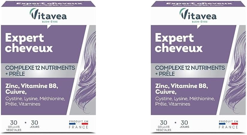 Vitavea Expert Hair 12 Nutrients – Hair Food Supplement – Biotin (Vitamin B8), Zinc, Copper, Vitamins – 30 Capsules – 1 Month Cure – Vegan – Made in France (Pack of 2)