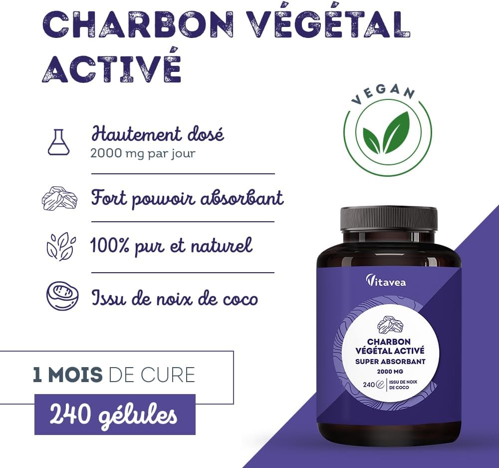 Vitavea Super Absorbent Vegetable Activated Carbon 2000 mg – 240 Capsules – Natural Vegetable Charcoal from Coconut – 1 Month – Made in France