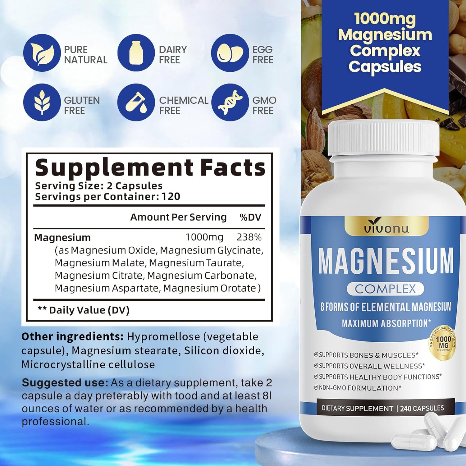 VivoNu Magnesium Bisglycinate | Magnesium Complex 8 in 1, High Content 1000mg /d | 240 Vegan Capsules | Sleep, Stress, Fatigue – Maximum Absorption & Easy Assimilation