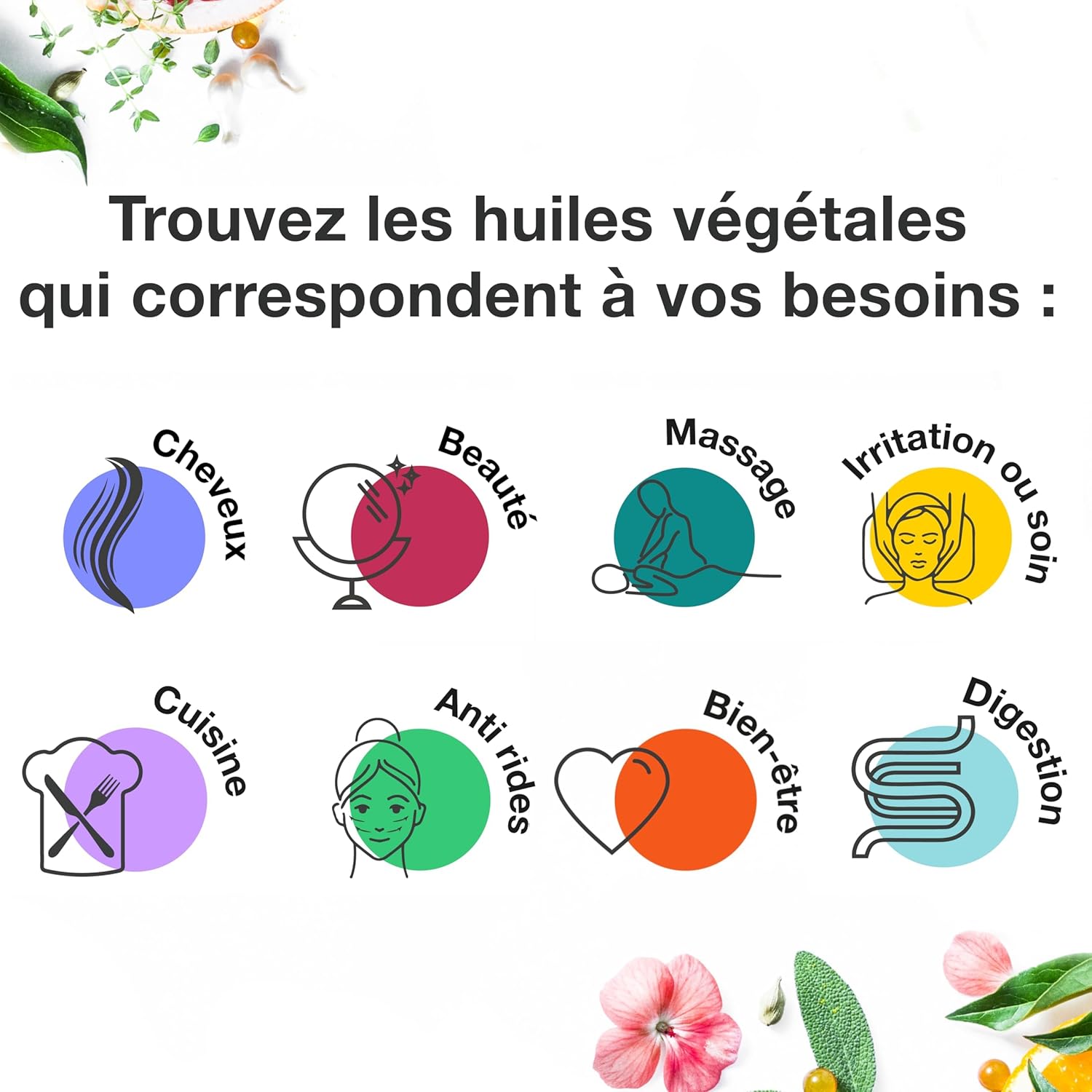 Nutritional richness: Oil naturally concentrated in polyunsaturated fatty acids (omega 6 and 9) to maintain the flexibility and elasticity of the epidermis on a daily basis