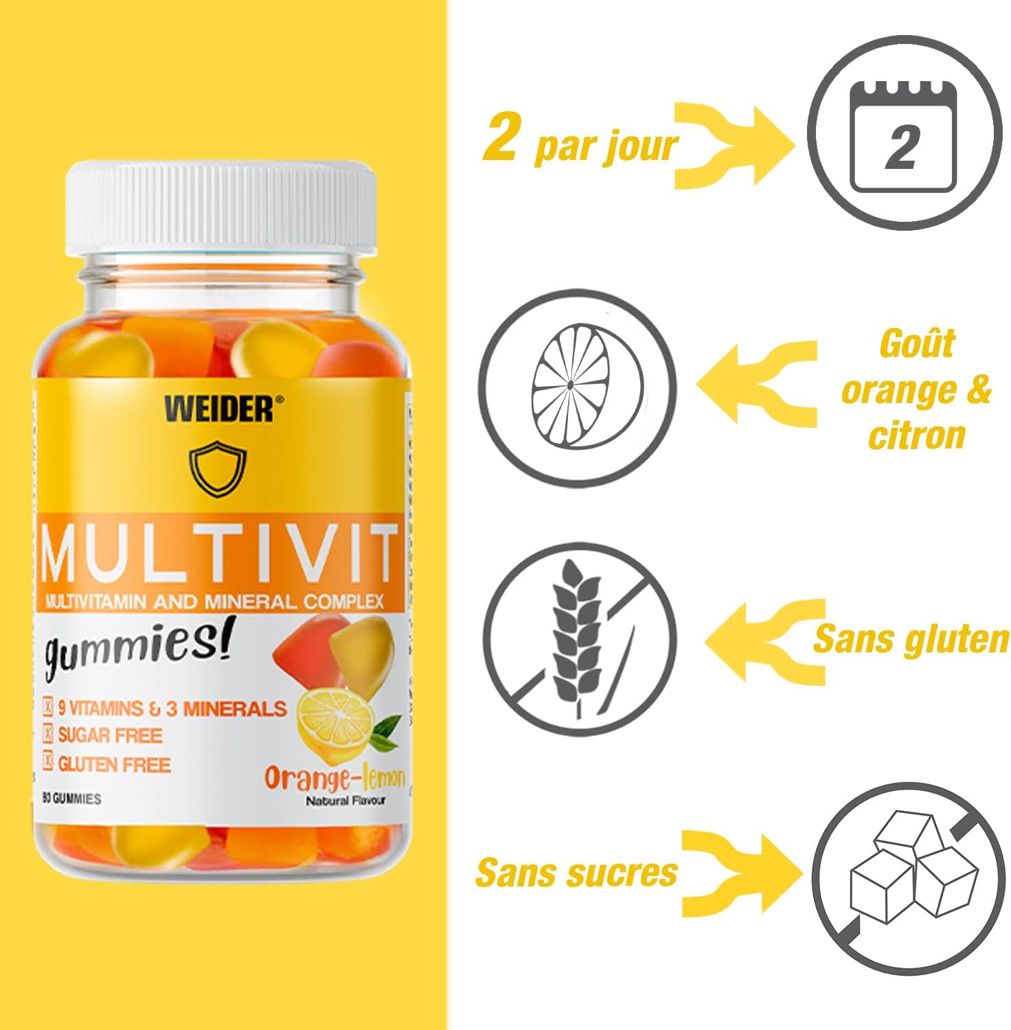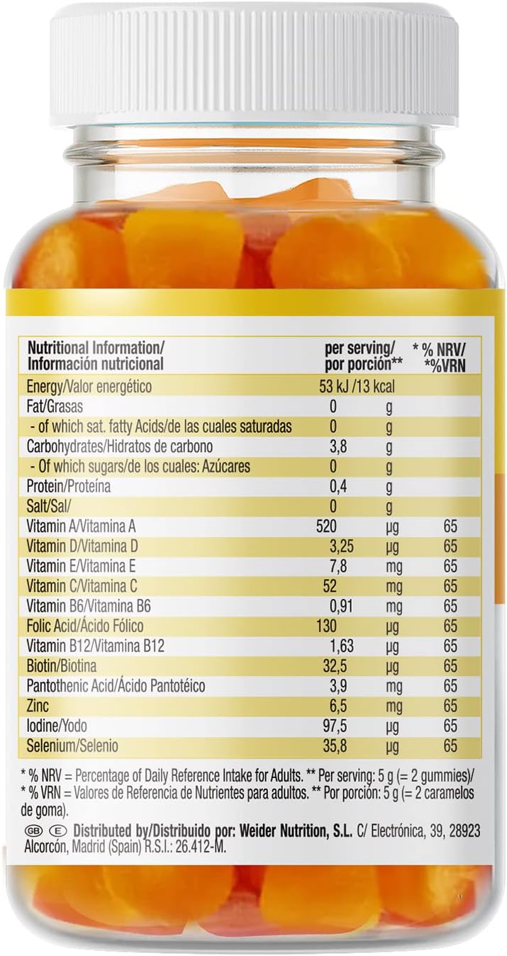 The most delicious way to stock up on vitamins and minerals. Sugar and gluten free. Only 17 kcal per serving. Multivit by Weider is an innovative and revolutionary solution for taking vitamin and mineral supplements. Vitamins and minerals are essential nutrients and should be consumed as a dietary supplement. However, our increasingly frantic pace of life leaves little room for healthy eating, which can lead to nutritional deficiencies. Adding a complete multivitamin supplement to your diet, such as Multivit, makes it much easier to supply these nutrients. It’s a simple and tasty way to make a difference in your diet. The Multivit formula is ultra-complete. Taking two Multivit gummies daily provides 65% of our daily vitamin and mineral requirement. Multivit contains 9 vitamins and 3 minerals that contribute to some of the most important functions of our body: Vitamin A: immunological function, iron absorption and skin care. Vitamin D: good calcium absorption, bone and muscle care. Vitamin E: powerful antioxidant. Vitamin C: Immune system care, formation of skin, cartilage and collagen. Powerful antioxidant. Vitamin B6: energy production, nervous system function and protein metabolism. Vitamin B5: energy production, hormone synthesis, fights fatigue. Vitamin B12: energy metabolism, red blood cell formation, nervous system and cognitive functions. Folic acid: synthesis of amino acids and formation of new cells. Biotin: energy production and care for skin, hair and nails. Zinc: energy production, fertility and antioxidant protection. Iodine: essential for proper brain, skin and metabolism function. Selenium: care for the immune system, skin and nails. Powerful antioxidant. As you can see, this is not just a candy! Multivit is 100% sugar free and 2 gummies only provide 17 kcal, so you don’t have to worry about your line or teeth! Taking your vitamins has never been so enjoyable. No more annoying pills. Now, taking vitamins will be the most enjoyable time of the day!