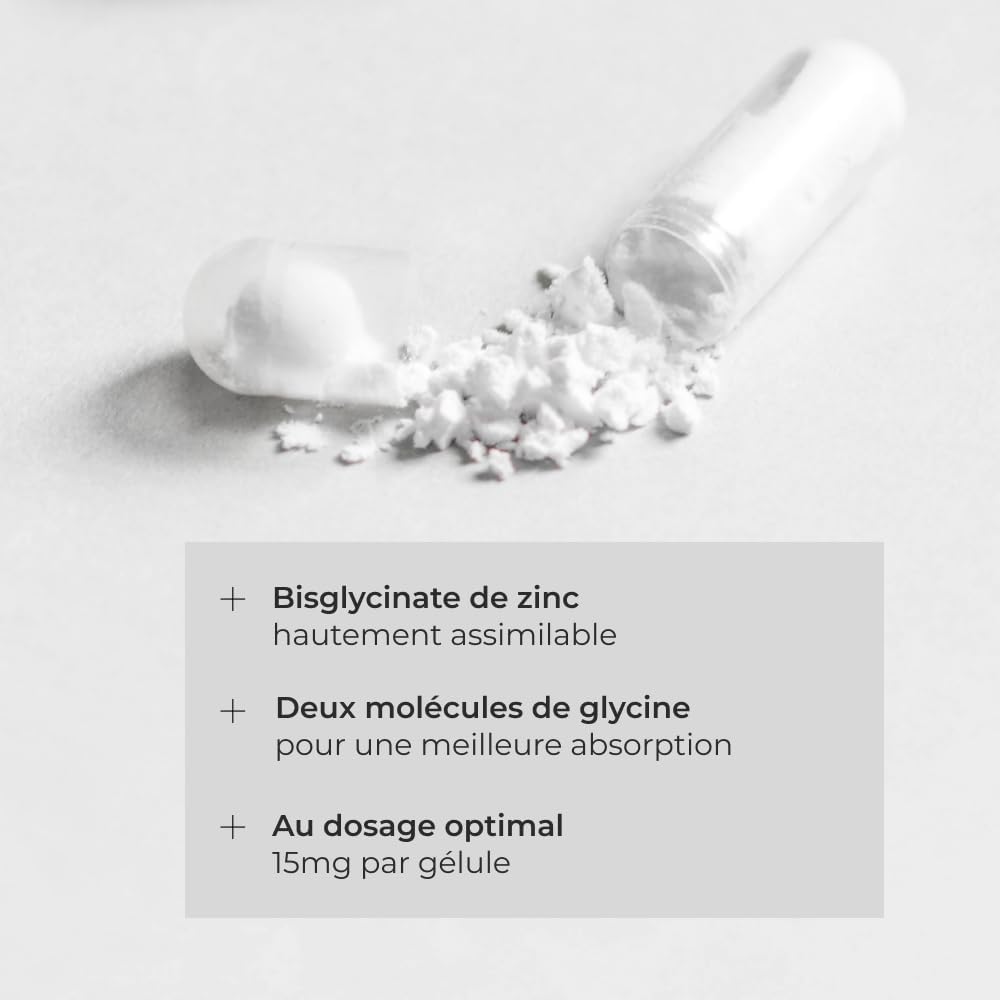 BISGLYCINATE FOR BETTER ABSORPTION Our Zinc is in the form of bisglycinate, combining two glycine molecules for optimal absorption. Well tolerated by the body, they effectively cross the intestinal barrier, making zinc easily assimilated. Our food supplement therefore enjoys optimal bioavailability for real digestive comfort unlike zinc oxide or citrate.