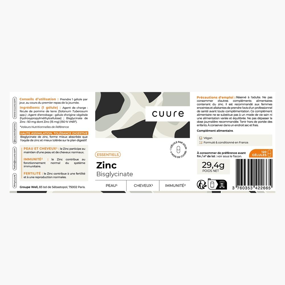 Zinc Bisglycinate [15mg] – Cuure – 120 days – High Absorption and 100% Pure – Immunity, Hair & Skin (Acne) – Made in France