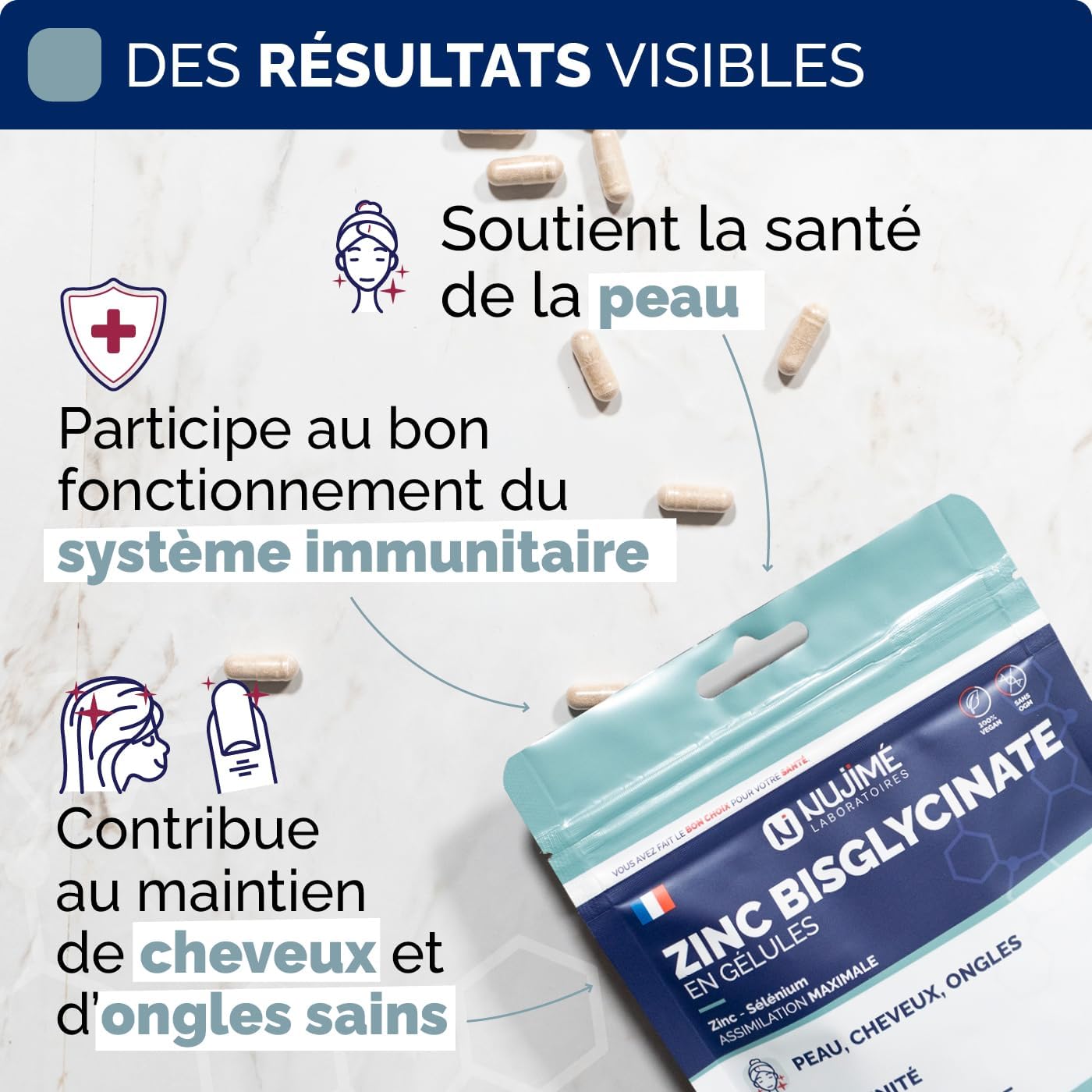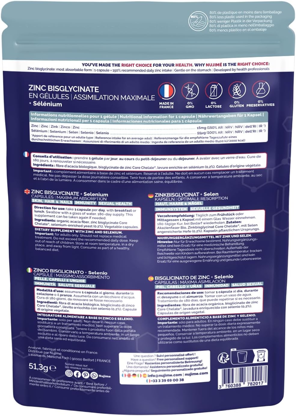 Innovative complement, made in France: developed by our healthcare professionals and entirely made in France, our formula containing 180 capsules of Zinc Bisglycinate + Selenium reflects the Nujimé commitment to impeccable quality. Each ingredient has been rigorously selected for its purity, bioavailability and proven efficacy. All in an innovative formula, 100% vegan, no preservatives, no GMOs, no artificial flavors or colours and tested by independent laboratories. A supplement designed with demand, to accompany your well-being every day.