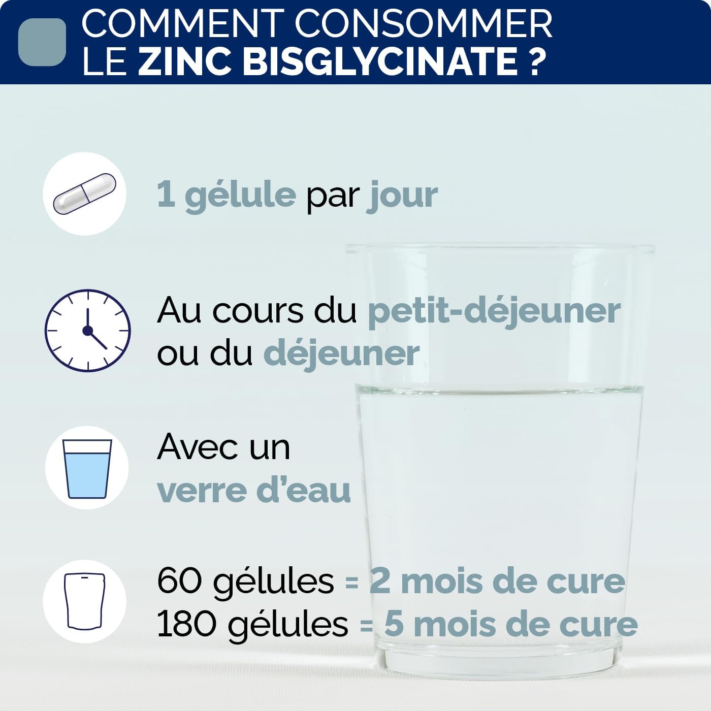 Le texte indique « COMMENT CONSOMMER NOTRE BISGLYCINATE DE ZINC EN GÉLULES ? » Infographie présentant les instructions posologiques des suppléments avec des icônes pour « 1 gélule par jour » et « Stock de 6 mois ».Le texte indique « COMMENT CONSOMMER NOTRE BISGLYCINATE DE ZINC EN GÉLULES ? » Infographie présentant les instructions posologiques des suppléments avec des icônes pour « 1 gélule par jour » et « Stock de 6 mois ».