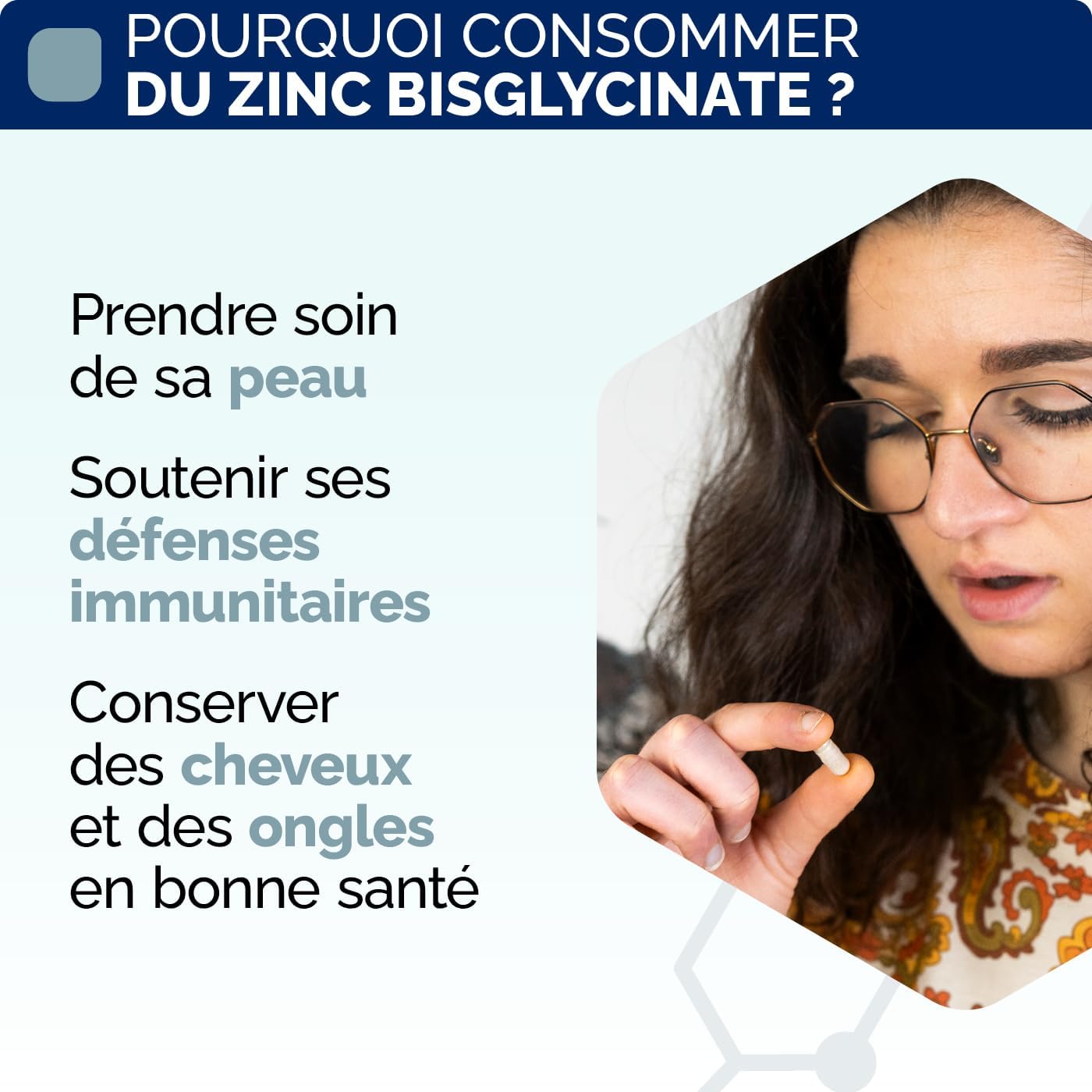 Le texte se lit comme suit : « LES POINTS FORTS DE NOTRE ZINC BISGLYCINATE EN GÉLULES », « 1 gélule = 150 % des besoins journaliers en zinc », « Bisglycinate de zinc + forme la plus assimilable », « Excellente tolérance digestive », « Zinc breveté Cava Chelate® de haute qualité »Le texte se lit comme suit : « LES POINTS FORTS DE NOTRE ZINC BISGLYCINATE EN GÉLULES », « 1 gélule = 150 % des besoins journaliers en zinc », « Bisglycinate de zinc + forme la plus assimilable », « Excellente tolérance digestive », « Zinc breveté Cava Chelate® de haute qualité »