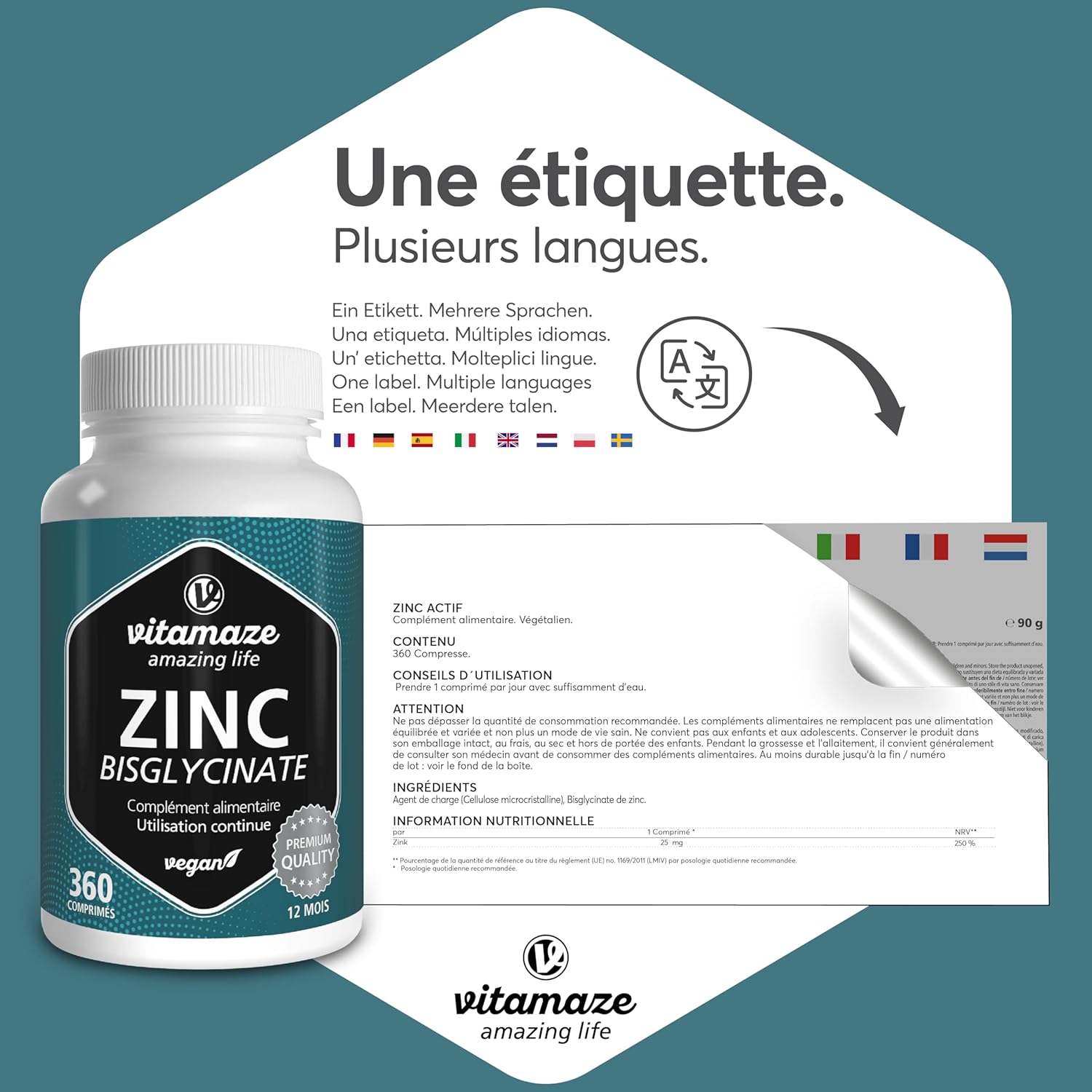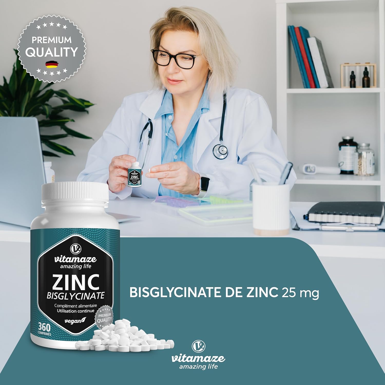 HIGH DOSE: 360 vegan tablets with 25 mg zinc bisglycinate per 1 tablet for 1 year for permanent intake. For normal functioning of the immune system, vision, maintaining normal skin, hair, nails and bones.